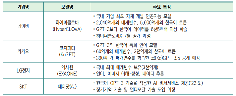수 천 억 개의 파라미터가 있는 LLM 모델을 직접 구축하는 것은 어렵지만, 오픈소스로 공개된 기초 모델을 사용하고 싶은 산업/분야에 대한 데이터로 Fine-Tuning 해 사용하는 연구는 계속되고 있습니다. 앞서 언어 모델은 '대화시스템'이 아닌 단어 확률을 학습한다고 언급했지만, 거대한 데이터를 학습시킨 LLM 모델은 하나의 대화형 시뮬레이션으로 성장하고 있습니다. 이러한 모델과 도메인 지식을 잘 활용하면 기업 맞춤형 솔루션을 구축하는 등 다방면으로 활용도가 높아지게 되는데, 덕분에 글로벌 기업뿐만 아니라 우리나라 기업들도 LLM에 대해 적극적으로 투자하고 있는 상황입니다.