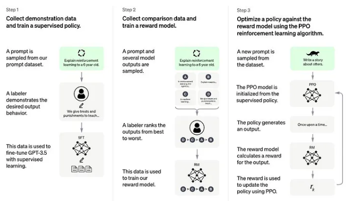ChatGPT에 적용된 RLHF를 살펴보면 크게 3가지 단계로 나누어집니다. 우선, 사람이 선별한 Instruction Tuning 된 적은 양의 샘플 데이터로 Pre-triained 모델을 Supervised Fine-Tuning 합니다.