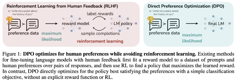DPO는 인간 피드백(선호도)에 맞는 결과를 도출한다는 것은 RLHF와 똑같지만, RLHF와는 달리 Reward Model이 필요하지 않아 RLHF에 대한 대안으로 주목을 받았습니다.