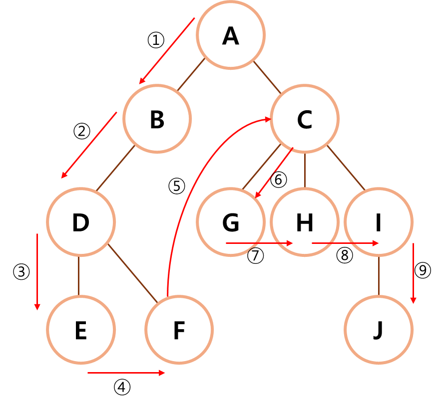 예시 그래프를 통해 노드 A부터 시작하는 DFS를 실행하면 아래와 같은 순서로 탐색을 진행한다.