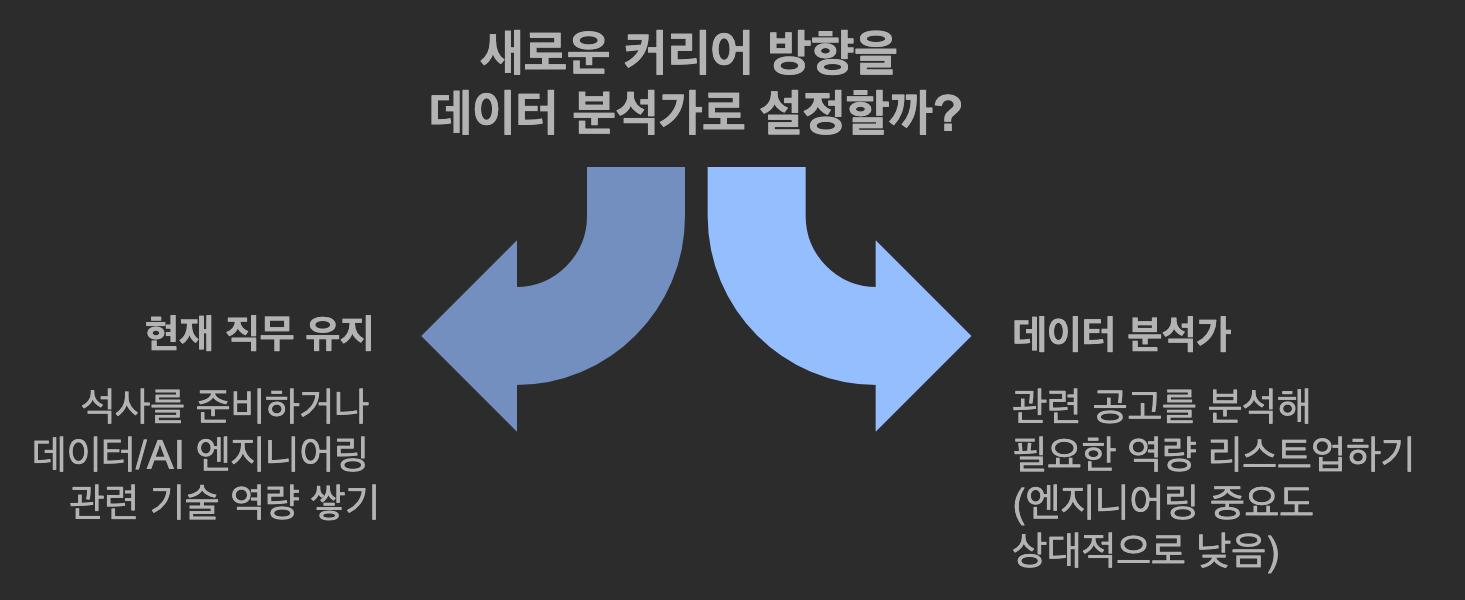 개발에 대한 로망때문에 계속 엔지니어링에 미련을 버리지 못했는데, 객관적으로 봤을 때 나는 엔지니어보다는 분석을 더 즐겁게 잘 할 수 있을 것 같다는 생각이 들었다. 비즈니스 문제를 정의하고, 그것을 분석하고 해결하는 데이터 분석가.