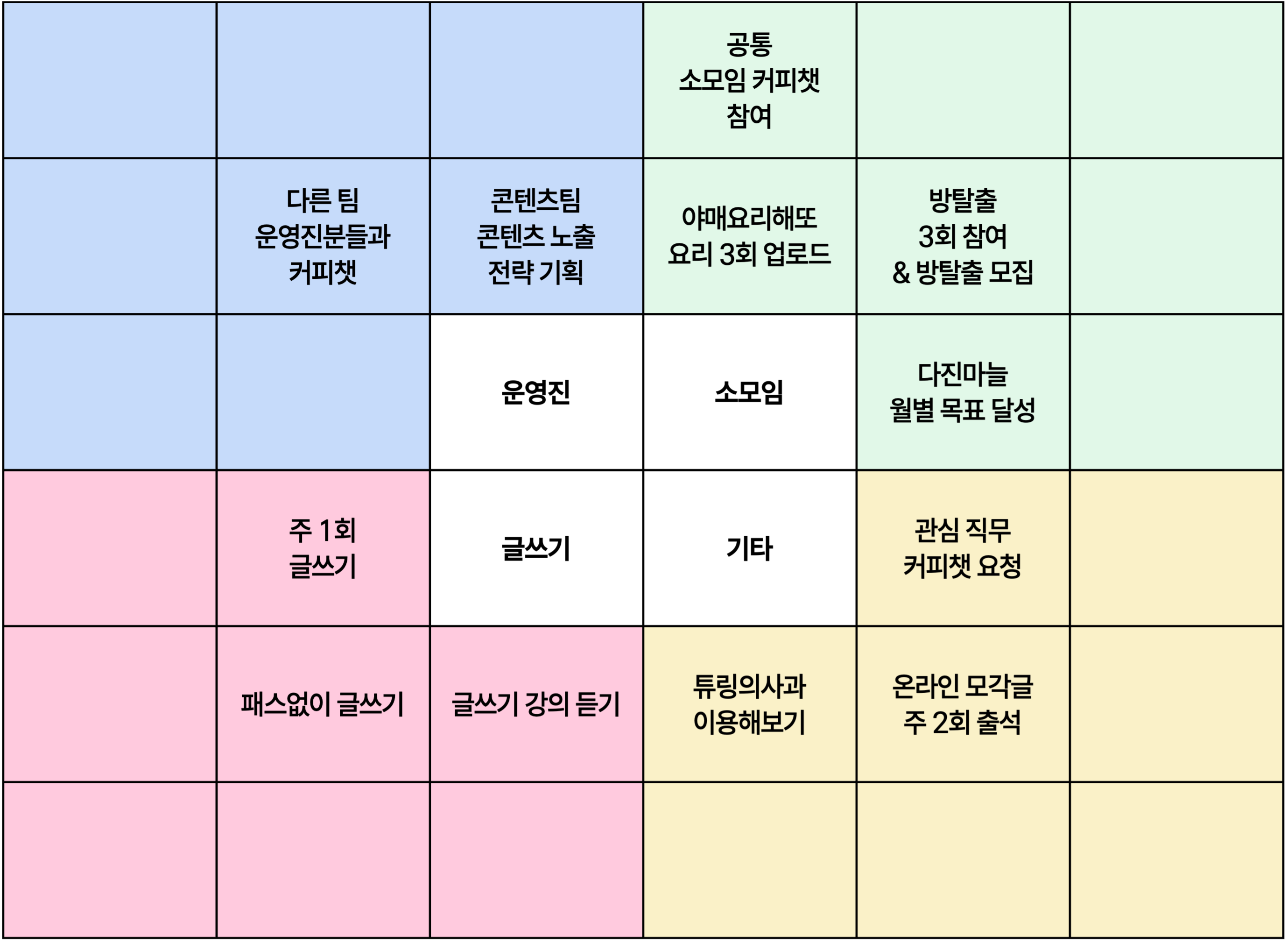 글또가 본격적으로 시작한지 2주 정도가 지난 지금, 다양한 활동을 해보려고 하고 있다. 하지만 이전 취업생활과 마찬가지로 무작정 일을 벌리기만 하면 무엇 하나 완성되지 못하고 시도에 그칠 것 같아 카테고리 별로 액션 플랜을 세워보려 하고 있다.