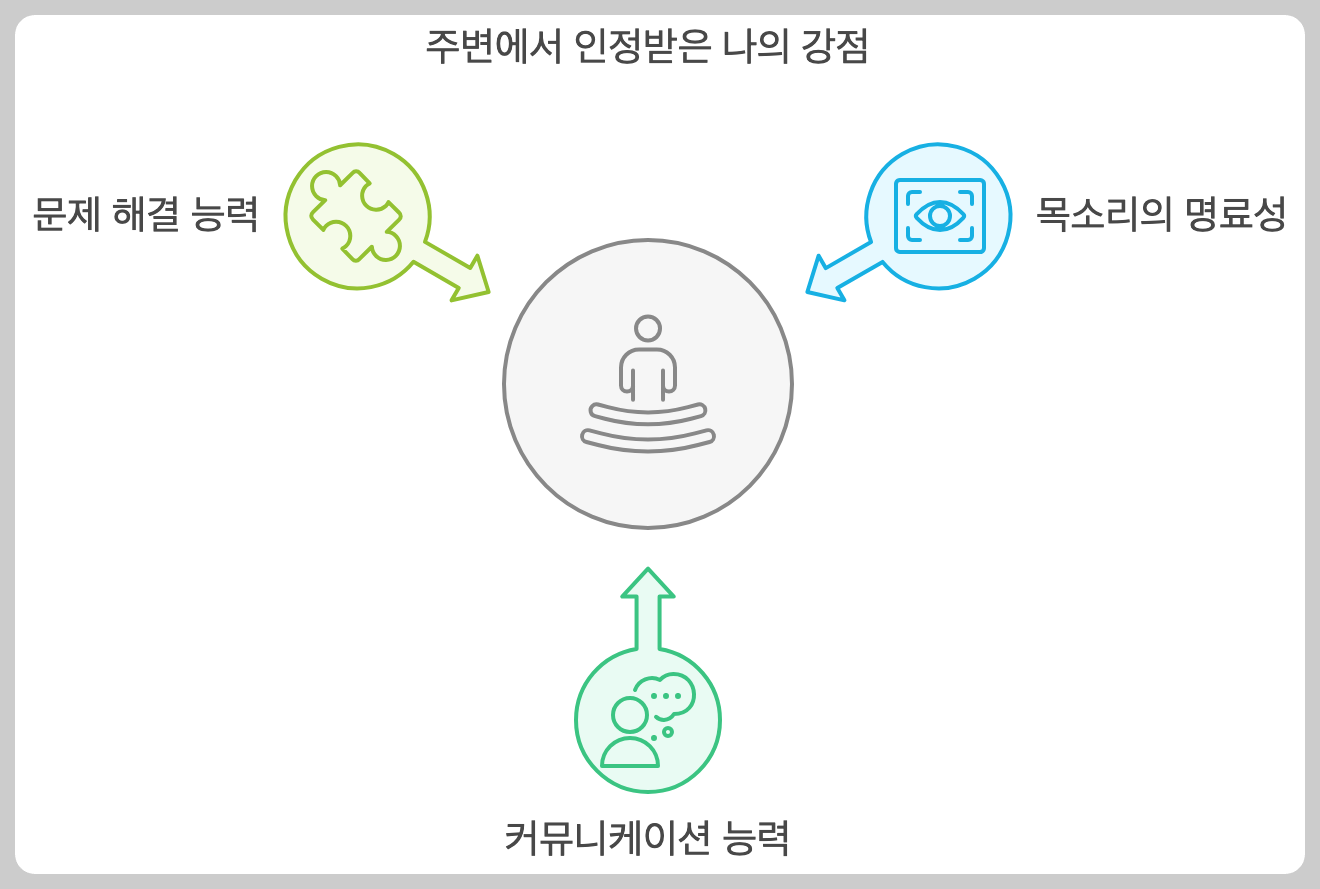 다음으로는 나의 강점을 생각해보았다. 스스로 느끼는 강점 외에 주변에서 인정 받았던 강점들을 중심으로.