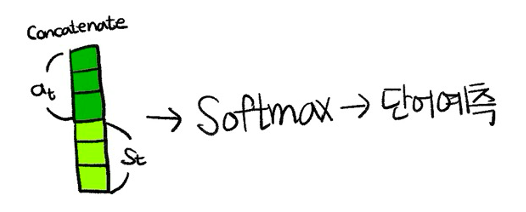 앞선 과정으로 구해진 어텐션 값을 예측에 반영하기 위해, 어텐션 값과 디코더의 t 시점의 은닉상태를 연결합니다. (Concatenate) 이렇게 연결된 값을 디코더의 입력으로 넣어 Softmax 함수를 통해 최종적으로 단어 예측을 하게 됩니다. 모든 정보를 압축해서 Context Vector 형태로 전달했던 Seq2Seq과 달리 디코더의 현재 시점에서 가장 유사한 입력 단어를 고려해 출력하기 때문에 보다 뛰어난 성능을 보일 수 있게 됩니다.