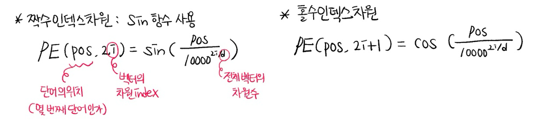 그림에서 PE는 Positional Encoding을 나타냅니다. 참고로 사인과 코사인을 쓰는 이유는 단어 간의 상대적 위치를 나타내는 데 유용하고, 이를 통해 모델이 두 단어 간의 거리 정보를 쉽게 계산할 수 있기 때문입니다. 이를 통해 모델은 입력 문장의 단어 간 상대적 위치를 이해하고, 문장의 구조적 의미를 더 잘 학습할 수 있습니다.