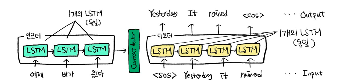 * Seq2Seq(Sequence-to-Sequence) : 입력 시퀀스를 받아 출력 시퀀스로 변환하는 모델로, 주로 번역기에 사용됨. RNN이나 LSTM과 같은 순환 신경망 모델을 기반으로 작동하며, 인코더와 디코더로 구성됨.