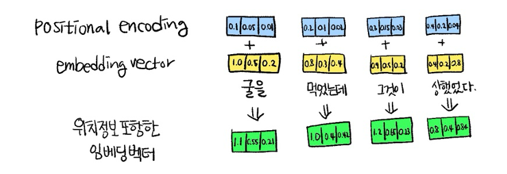 위치 인코딩 즉, 위치 정보를 부여하는 방식입니다. 단어 벡터에 단어의 순서를 나타내는 벡터를 추가해서, 이를 통해 모델이 단어의 상대적 또는 절대적 위치 정보를 학습할 수 있도록 해줍니다.
