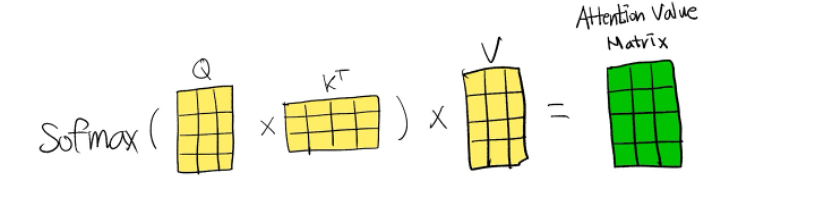 위 그림은 하나의 입력 단어에 대해 Self-Attention에서 Attention Value를 구하는 흐름을 그린 것입니다. Attention 계산 방식과 동일합니다. 그저 Query와 Key, Value가 모두 동일하게 입력된 문장에 대한 값이라는 게 차이점이죠. 그림은 한 번에 하나의 단어를 계산하는 것처럼 표현했지만 실제로는 Query(입력단어) 행렬을 통해 아래 그림처럼 한 번에 연산하게 되고, 각 입력 단어 간의 연관성을 나타내는 Attention Matrix 가 만들어지게 됩니다.