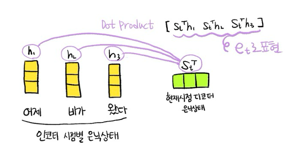 앞선 글에서 기존 Attention 구조를 설명한 그림입니다. 디코더는 $S_{t}$와 인코더의 각 은닉 상태 $h_{1}$, $h_{2}$. $h_{3}$간의 내적(Dot Product)을 계산하여, 입력 단어들과의 관련성을 측정합니다. 이 계산 결과는 가중치로 사용되어, 출력 단어 생성 시 어떤 입력 단어가 더 중요한지 결정합니다. 이 때 디코더는 인코더의 출력만을 참조하며, 입력 단어 간의 관계는 고려하지 않습니다. 즉, 여기서 인코더와 디코더는 단방향 의존성(인코더 → 디코더) 관계를 지닙니다. 때문에 기존 Attention에서 디코더는 출력 문장을 생성할 때 이전 출력 단어를 기반으로 다음 단어를 생성하고, 이전 단어 정보가 있어야만 다음 디코더에서 처리할 수 있기 때문에 순차적 의존성을 지니는 한계를 가집니다.