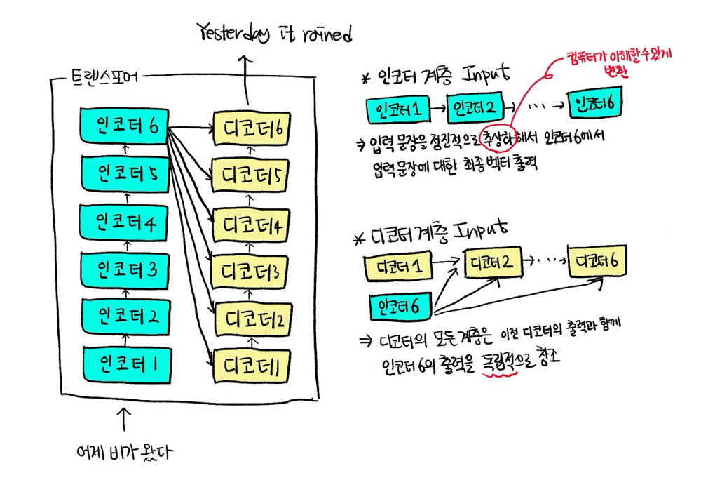 논문에서는 인코더와 디코더 각각 6개 사용했습니다. 즉, 같은 구조의 인코더와 디코더 계층이 6번 반복되는 것입니다.