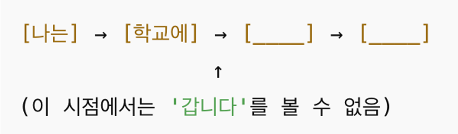 - Input : 이전까지 생성된 단어들을 입력으로 사용합니다. (ex: "<start>", "나는", "밥을", ... 이런 식으로 점점 늘어나게 됩니다.)