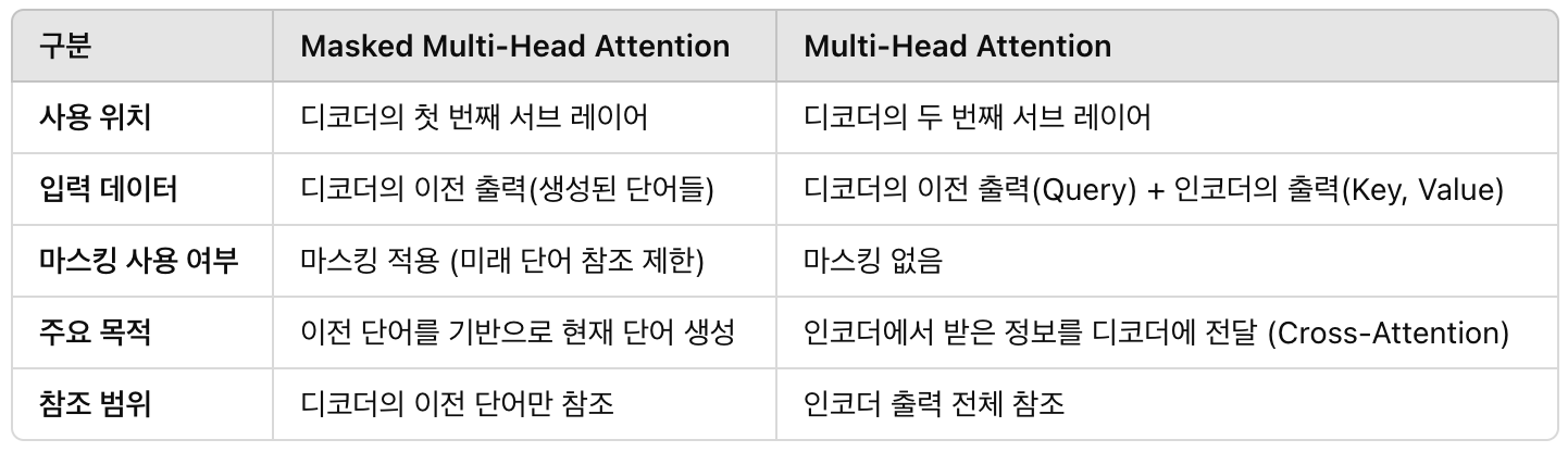 아래 표는 Masked Multi-Head Attention과 인코더-디코더 Multi-Head Attention의 차이를 한눈에 정리한 것입니다.