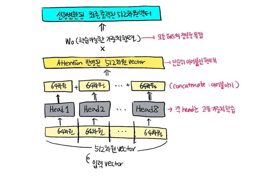 특히, Multi-Head Attention은 단일 Self-Attention이 아닌 여러 개의 Self-Attention Head가 병렬로 작동하기 때문에, 문법적 관계, 의미적 연관성 등 다양한 관점을 학습할 수 있습니다.